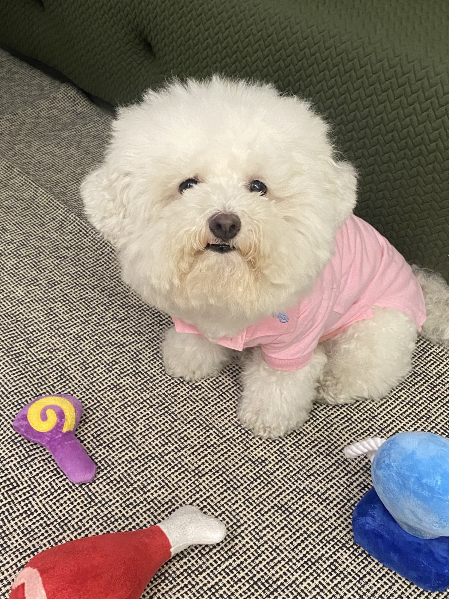 What a fluffball! The pink shirt is just perfect. Adorable!